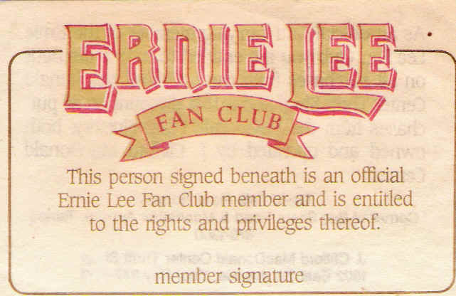 Fans could join the Ernie Lee fan club and receive a photo, membership card, and T-shirt. These images were shared with us by Rick Alter, one of Ernie's fans from Valrico, Florida.